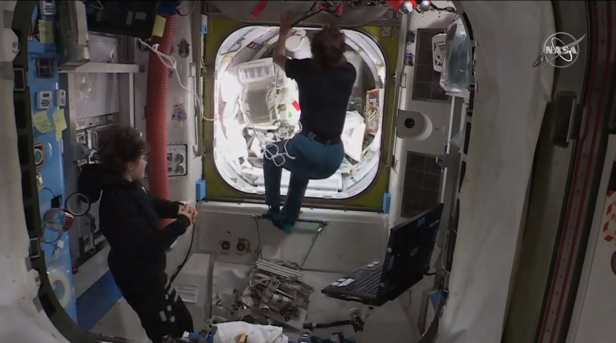 There is a small problem depressurizing the airlock on the ISS before the spacewalk, a strap is caught in the hatch causing a leak. So they are reopening the hatch to remove it and start over