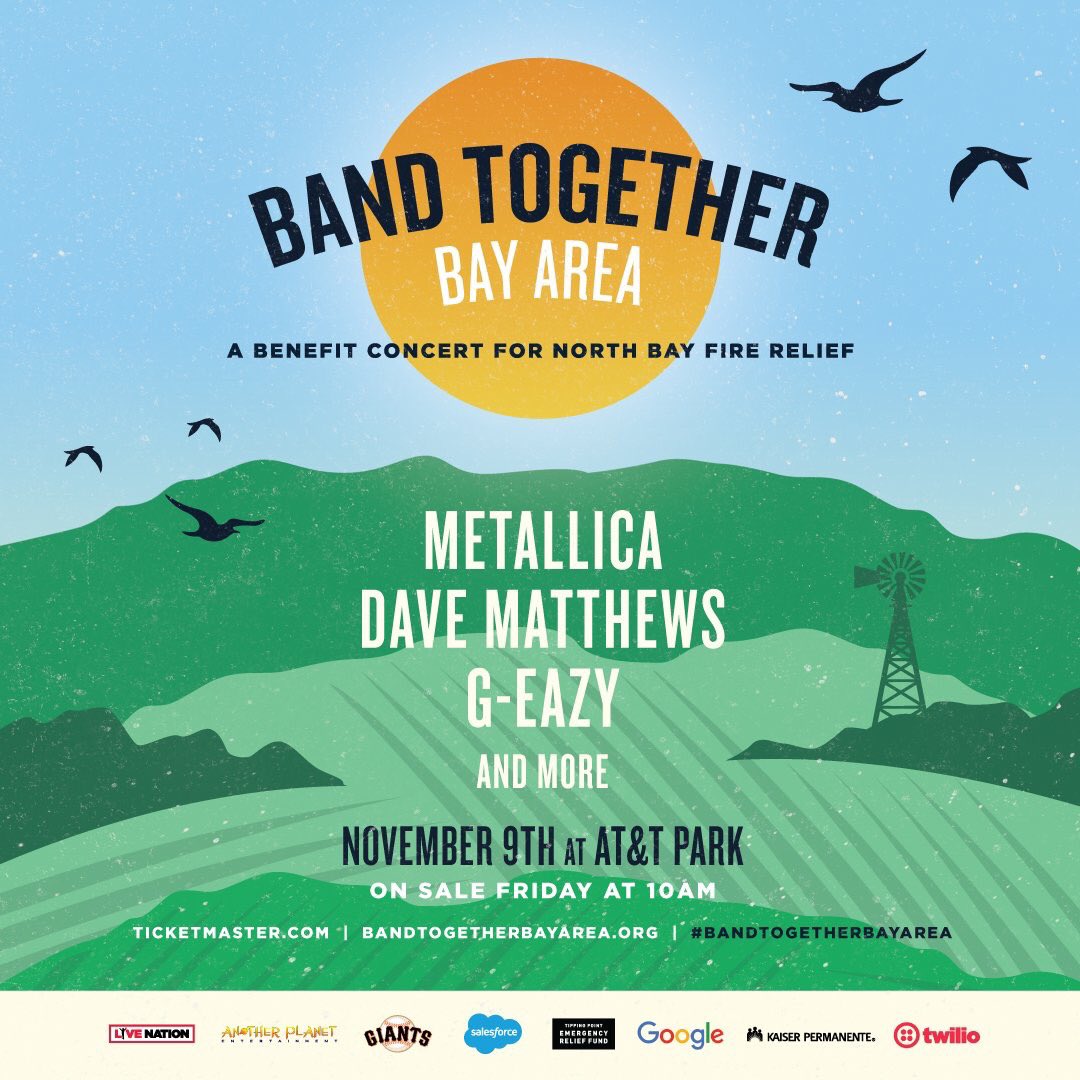 #BandTogetherBayArea. One night - Nov 9 - three amazing bands all take the stage to benefit North Bay fire relief.@Metallica@G_Eazy@DaveMatthewsBnd Tix on sale Friday at 10am!pic.twitter.com/7V5PdcrxBs