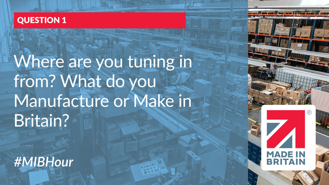 #MIBHour that will run until 3pm today! Lets kickstart today by letting us know where you are tuning in from and what your Manufacture/Make in Britain! Don't forget to include the#MIBhour throughout your tweets today!pic.twitter.com/fkDzxqVHBc