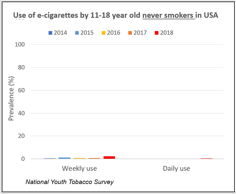 As US public health officials know, but strangely hide from the public, the prevalence of frequent vaping (the only ones who might be "addicted") among under-age never-smoking teens (the only ones who are NEW to nicotine) remains vanishingly small (see NYTS 2018 data).