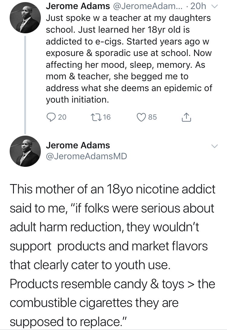 @Surgeon_General tweets. Dr Adams blocked me from his personal account, apparently for criticising the basis of his tweets about the "youth vaping epidemic". Concerns explained