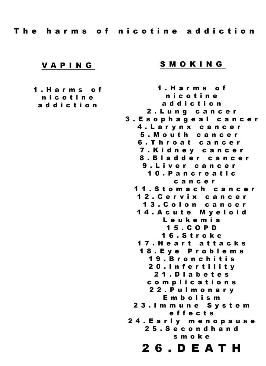 I wouldn't even say nicotine addiction. Addiction = dependence + harm Nicotine isn't carcinogenic, therefore no harm. Nicotine is a dependence, not an addiction.
