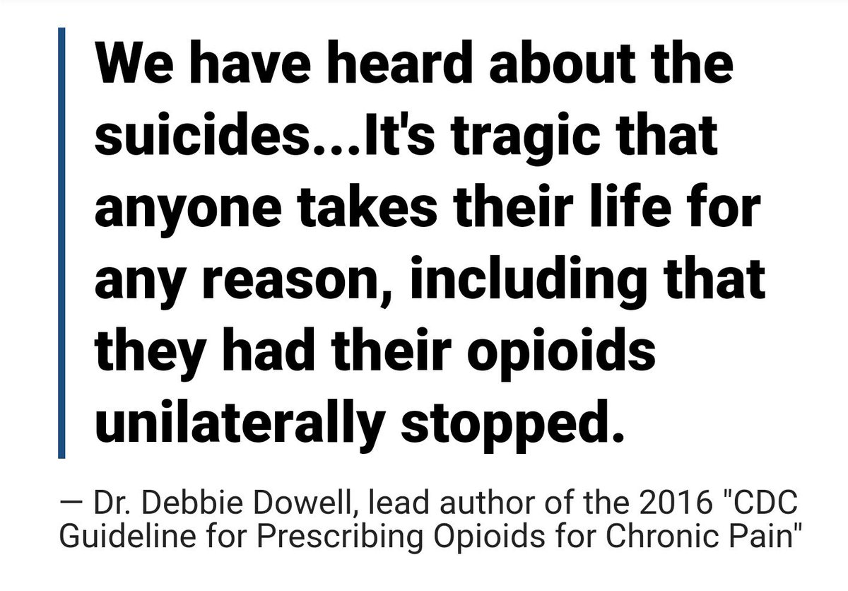 This topic needs to include the pain patients being cut off their pain meds & contemplating or completing Suicide.https://medium.com/@ThomasKlineMD/opioidcrisis-pain-related-suicides-associated-with-forced-tapers-c68c79ecf84d …