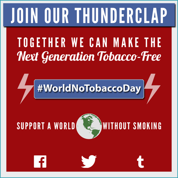 Support a world without smoking -- join @HHSGov’s #WorldNoTobaccoDay #Thunderclap: http://bit.ly/1jDCDbs pic.twitter.com/x2yYcf7Kwz