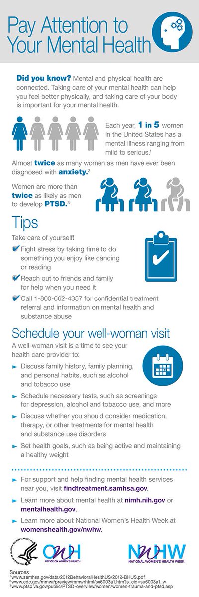 @Surgeon_General:Mental illness affects 1 in5 US women.It’s time 2 talk&reach out4help:http://1.usa.gov/1QCrBR5#NWHW pic.twitter.com/L3GZiQZDiD"