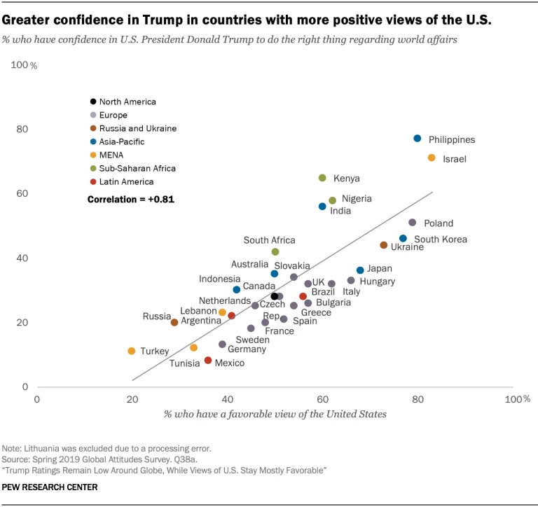 What? 65% of Kenyans "like" Trump 95% liked Obama (2010) Correlation between views of Trump & of US = 0.8 Is the favorable view of Trump due to Trump himself or the US generally? The two are a "bundle" Pew has timeseries data to unpack. Can we see how much is views of US vs Trumphttps://twitter.com/CNNAfrica/status/1215349271752515589 …