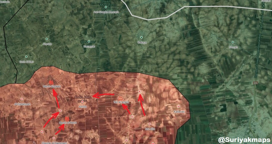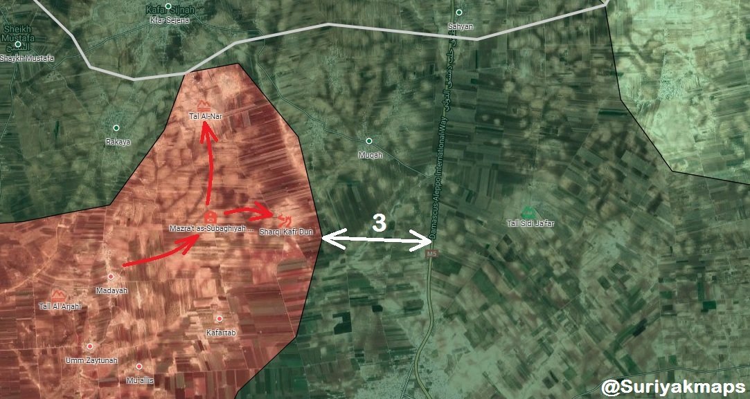 - Maarrat al-Numan front: #SAA #Tiger_Forces liberated Maarshurin, Zalana & took control over a 5 Km of M5 HWY with the liberation of Babilla & Dana. Ghadfah village is empty (light grey dot)