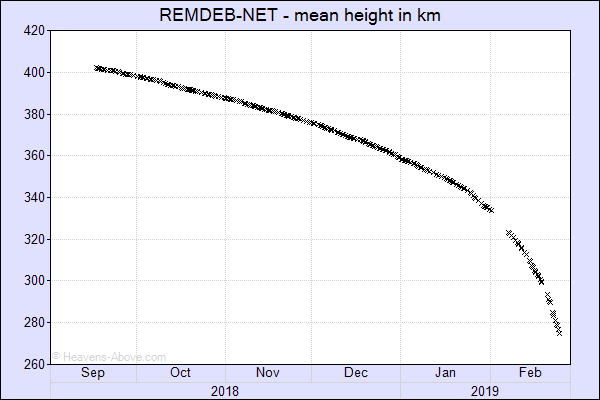 Surreys REMDEB-NET now passing though 260km! Re-entry predicted 2nd March. The cubesat enclosed by the NET will be the first element of the