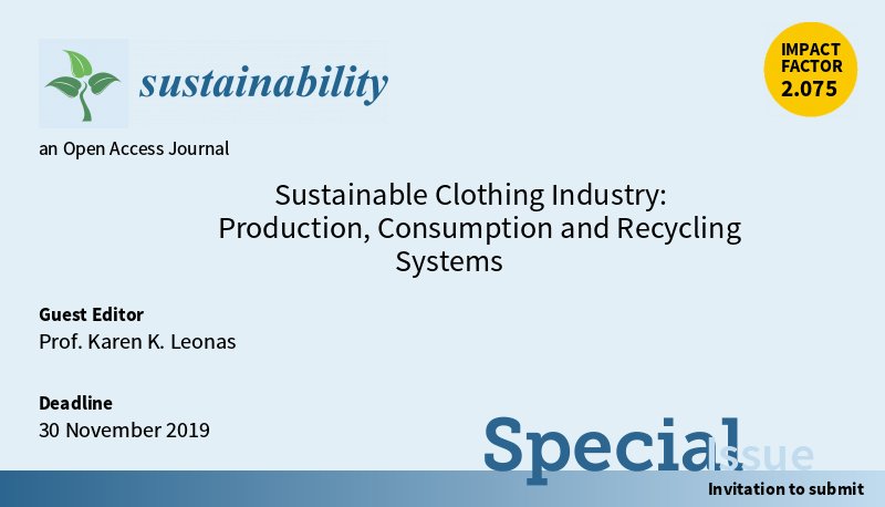#mdpisustainability Special Issue "Sustainable Clothing Industry: Production, Consumption and Recycling Systems" edited by Prof. Karen K. Leonas from North Carolina State University @NCState #fastfashion #consumption #fashionindustry #clothing #recycling