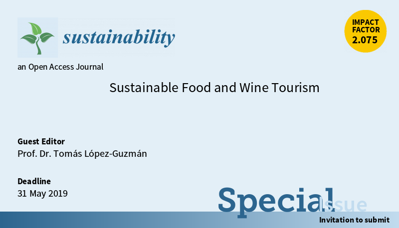 Invitation for submission!! New special issue “Sustainable #food and #wine #Tourism”, guest edited by Prof. Dr. Tomás López-Guzmán from @Univcordoba. #Tourist #Gastronomy #Destinations Read more at: https://www.mdpi.com/journal/sustainability/special_issues/food_wine …pic.twitter.com/sQlCYdqmtu
