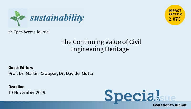Invitation for submission!! New special issue “The Continuing Value of Civil #Engineering #heritage”, guest edited by Prof. Dr. Martin Crapper and Dr. Davide Motta from @NorthumbriaUni. #construction Read more at: https://www.mdpi.com/journal/sustainability/special_issues/ceh_sus …pic.twitter.com/VNvzaDgeXr