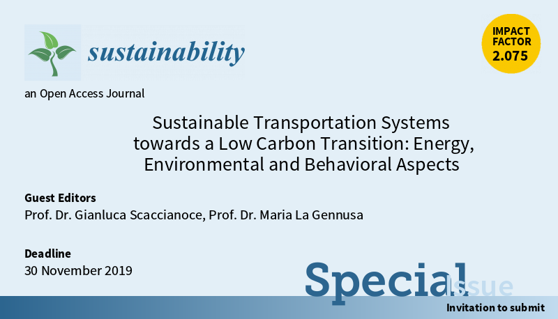 New Special Issue “#Sustainable #Transportation Systems towards a Low Carbon Transition: #energy, #environmental and #Behavioral Aspects” is open for submission. #RenewableEnergy