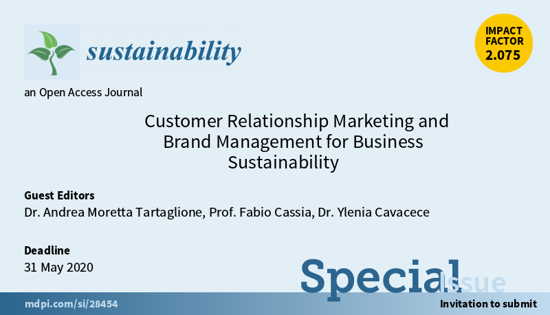 New Special Issue “#Customer #relationship #marketing and #brand #Management for #business #sustainability” is open for submission, edited by Dr. Andrea Moretta Tartaglione, Prof. Fabio Cassia @fabiocassia1 and Dr. Ylenia Cavacece.