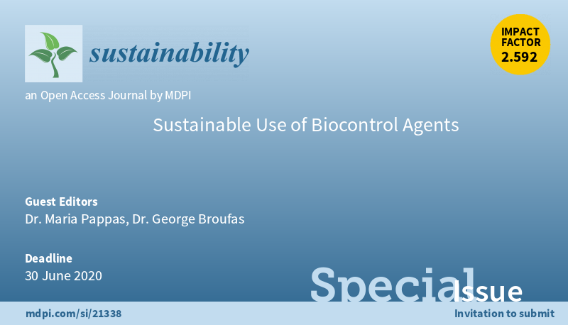 Deadline for Special Issue "Sustainable Use of #Biocontrol #Agents" is extended till 30 June 2020. We look forward to receive your interesting work on this topic. #pestmanagement #biologicalcontrol #crop #Production @maria_pappas @GBroufas @career_duth