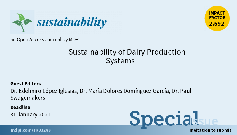 Special Issue “Sustainability of Dairy Production Systems” welcomes submissions. Guest Editors are Dr. Edelmiro López Iglesias, Dr. María Dolores Domínguez García from @unicomplutense and Dr. Paul Swagemakers from @uvigo #dairyfarm #AnimalWelfare More at: http://mdpi.com/journal/sustainability/special_issues/Dairy_Production_Systems …pic.twitter.com/U8VmHLbflf