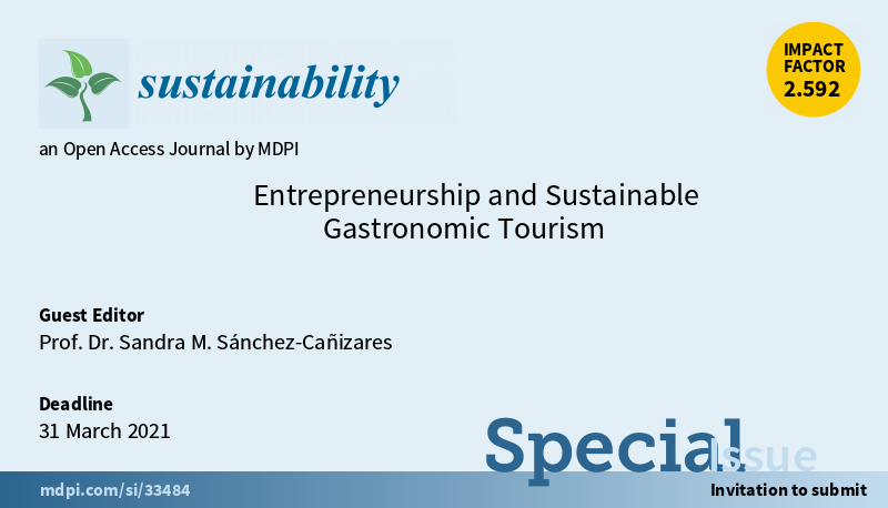 Special Issue “Entrepreneurship and Sustainable Gastronomic Tourism” welcomes submissions. Guest Editor is Prof. Dr. Sandra M. Sánchez-Cañizares from @Univcordoba #Entrepreneurship #food #organic #Tourism More at: https://www.mdpi.com/journal/sustainability/special_issues/gastronomic_tourism … (submission deadline: 31 March 2021)pic.twitter.com/XfhGx7T2Nk