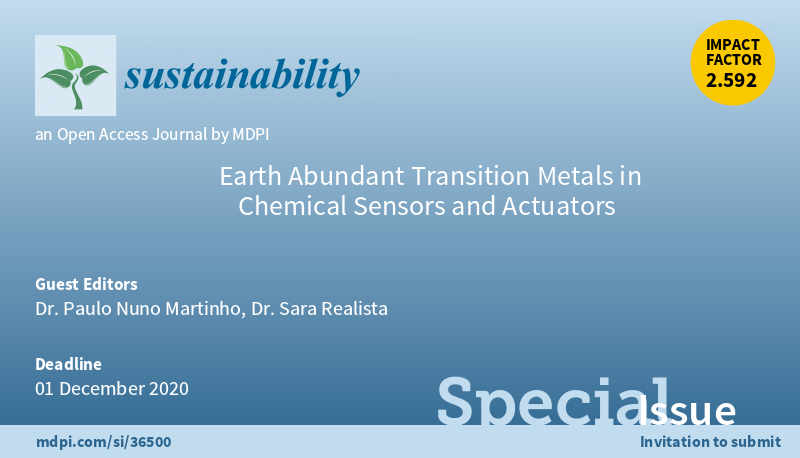 Special Issue "Earth Abundant Transition Metals in #Chemical Sensors and Actuators" welcomes submissions. The editors are Dr. Paulo N. Martinho @ULisboa_ and Dr. Sara Realista @NOVAunl More at:https://www.mdpi.com/journal/sustainability/special_issues/Earthabundant_transitionmetals … (Deadline: 01 Dec. 2020) #photocatalysis #electrocatalysispic.twitter.com/I3NVVZjId9