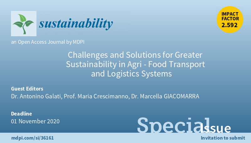 Special Issue "Challenges and Solutions for Greater Sustainability in Agri-Food #Transport and #Logistics Systems" welcomes submissions. Edited by Dr. Antonino Galati, Prof. Maria Crescimanno and Dr. Marcella Giacomarra @udepalermo