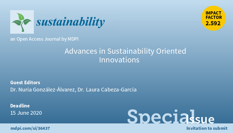 Special Issue "Advances in Sustainability Oriented #Innovations" welcomes submissions. The Editors are Dr. Nuria González-Álvarez and Dr. Laura Cabeza-García @unileon More at:https://www.mdpi.com/journal/sustainability/special_issues/advances_in_sustainability … (Deadline: 15 June 2020)pic.twitter.com/JtoT7A0kJy