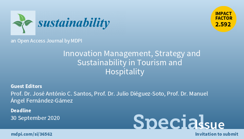 Special Issue "#InnovationManagement, Strategy and Sustainability in #Tourism and #Hospitality" welcomes submissions. Edited by Prof. José A. C. Santos, @UAlg, @Jdieguezsoto and Prof. Manuel Á. Fernández-Gámez @InfoUMA