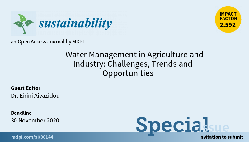 Special Issue "#WaterManagement in Agriculture and Industry: Challenges, Trends and Opportunities" welcomes submissions. The editor is Dr. Eirini Aivazidou @Aristoteleio