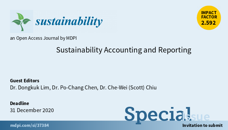 Special Issue "Sustainability #Accounting and #Reporting" welcomes submissions. Edited by Dr. Dongkuk Lim @SeaverAdmission @pepperdine, Dr. Po-Chang Chen @FarmerSchoolMU @miamiuniversity and Dr. Scott Chiu @winonastateu