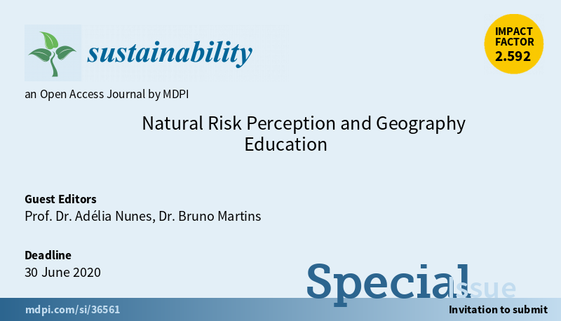 Special Issue"#NaturalRiskPerception and #GeographyEducation" is open. Edited by Prof. Dr. Adélia Nunes and Dr. Bruno Martins @UnivdeCoimbra