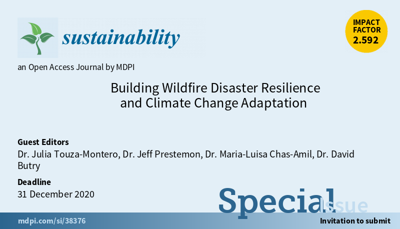 Special Issue "Building #WildfireDisasterResilience and #ClimateChangeAdaptation" is open. Edited by Dr. Julia Touza @yorkuniversity, Dr. Jeffrey Prestemon @forestservice , Dr. Maria-Luisa Chas-Amil @UniversidadeUSC and Dr. David Butry @NIST