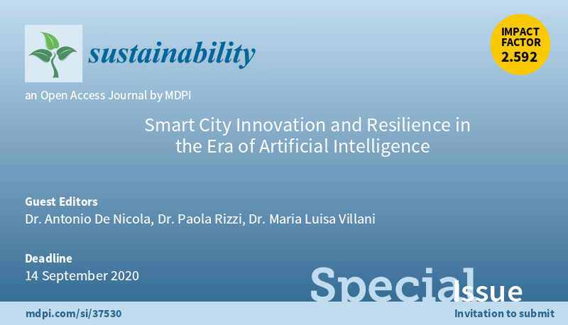 Special Issue "#SmartCityInnovation and Resilience in the Era of #ArtificialIntelligence" is open. Edited by Dr. Antonio De Nicola, Dr. Paola Rizzi and Dr. Maria Luisa Villani @ENEAOfficial @unissTwit @univaq More at:https://mdpi.com/journal/sustainability/special_issues/innovative_materials … (Deadline: 14 Sept. 2020)pic.twitter.com/SWBckQXiWU