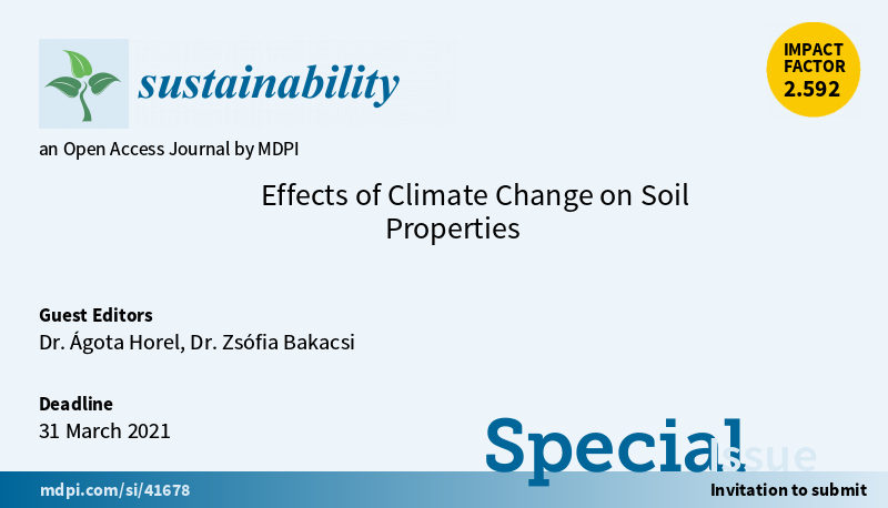 Special Issue “Effects of #ClimateChange on #SoilProperties" is open. Edited by Dr. Ágota Horel and Dr. Zsófia Bakacsi More at:https://www.mdpi.com/journal/sustainability/special_issues/Climate_SoilProperties … (Submission Deadline: 31 Mar. 2021) #Hydrology #Degradation #BiogeochemicalCycles #MineralCompositionEvolutionpic.twitter.com/bgKEDpURO2