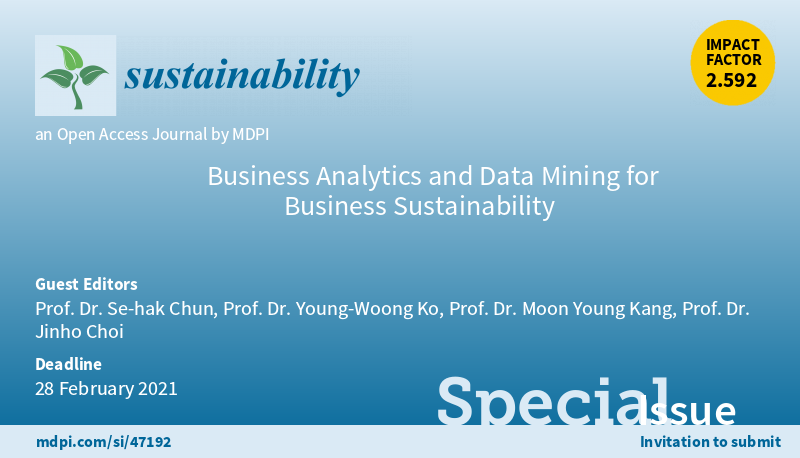 Special Issue "Business Analytics and Data Mining for Business Sustainability" welcomes submissions. Edited by Prof. Dr. Se-hak Chun from Seoul National University of Science and Technology and Prof. Dr. Young-Woong Ko from Hallym University More at: https://www.mdpi.com/journal/sustainability/special_issues/Business_Analytics …pic.twitter.com/X4vG4Pjx76
