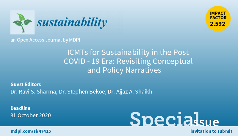 Special Issue "ICMTs for Sustainability in the Post COVID-19 Era: Revisiting Conceptual and Policy Narratives" welcomes submissions. Guest Editors are Dr. Ravi S. Sharma, Dr. Stephen Bekoe and Dr. Aijaz A. Shaikh More at: https://www.mdpi.com/journal/sustainability/special_issues/ICMT_susdev_conpolinar … (Deadline: 31 October 2020)pic.twitter.com/fQoQlvek8Y