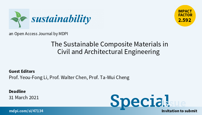Special Issue "The Sustainable Composite Materials in Civil and Architectural Engineering" welcomes submissions. Edited by Prof. Yeou-Fong Li, Prof. Walter Chen and Prof. Ta-Wui Cheng from National Taipei University of Technology More at: https://www.mdpi.com/journal/sustainability/special_issues/materials_engineering …pic.twitter.com/QJGXm9M9tD