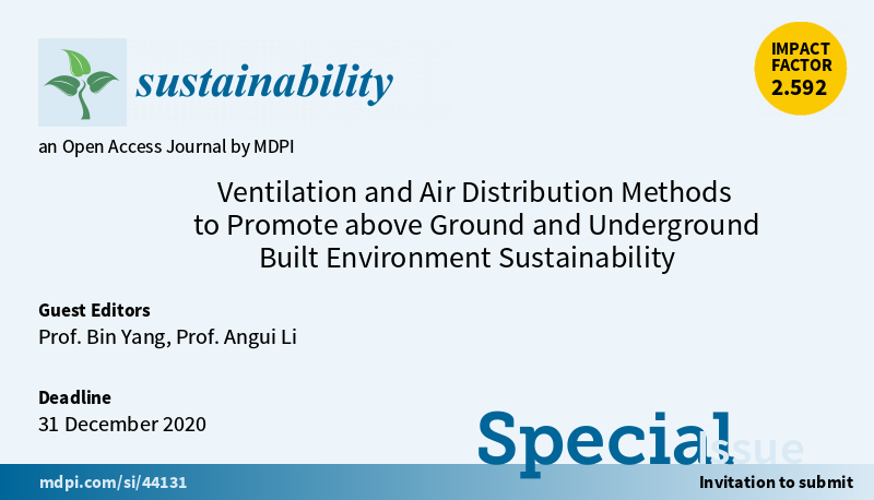Special Issue "Ventilation and Air Distribution Methods to Promote above Ground and Underground Built Environment Sustainability" welcomes submissions. Guest Editors are Prof. Bin Yang and Prof. Angui Li More at: https://www.mdpi.com/journal/sustainability/special_issues/ventilation_air_distribution … Submission deadline: 31 December 2020pic.twitter.com/cxiniYi7rd