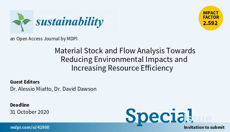 Special Issue "Material Stock and Flow Analysis Towards Reducing Environmental Impacts and Increasing Resource Efficiency" welcomes submission Edited by Dr. Alessio Miatto and Dr. David Dawson More at: https://www.mdpi.com/journal/sustainability/special_issues/Material_Stock_Flow_Analysis … (Submission deadline: 31 October 2020)pic.twitter.com/Nj9ukpQXqO