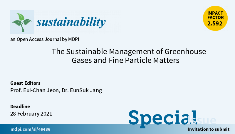 Special Issue "The Sustainable Management of Greenhouse Gases and Fine Particle Matters" welcomes submission Edited by Prof. Eui-Chan Jeon and More at: https://www.mdpi.com/journal/sustainability/special_issues/greenhouse_particle … (Submission deadline: 28 February 2021) #emission #reduction #GHG emission #inventorypic.twitter.com/5gSzyCsge5