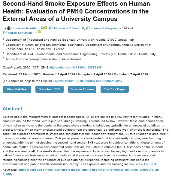Second-Hand Smoke Exposure Effects on Human Health: Evaluation of PM10 Concentrations in the External Areas of a University Campus;