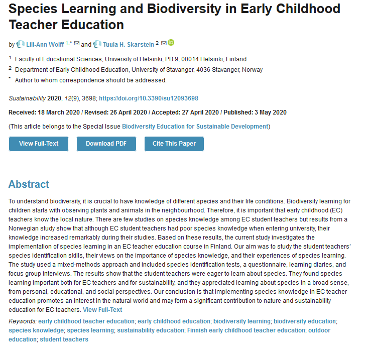 #SUSHighlyCitedPaper Species Learning and Biodiversity in Early Childhood Teacher Education; by Lili-Ann Wolff and Tuula H. Skarstein, https://www.mdpi.com/2071-1050/12/9/3698 …; #earlychildhoodeducation #sustainabilityeducationpic.twitter.com/WA4GPrQcV3