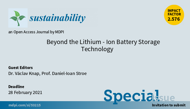 Special Issue "Beyond the Lithium-Ion Battery Storage Technology" welcomes submission Edited by Dr. Václav Knap and Prof. Daniel-Ioan Stroe More at: https://www.mdpi.com/journal/sustainability/special_issues/LIB_Storage_Tech … (Submission deadline: 28 February 2021) #Battery #Energy Storage Technologiespic.twitter.com/uBorXyPOG5