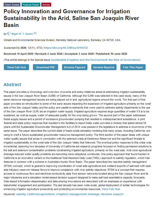 #SUSFeaturePaper Policy Innovation and Governance for Irrigation Sustainability in the Arid, Saline San Joaquin River Basin; by Nigel W. T. Quinn from Berkeley National Laboratory @BerkeleyLab https://www.mdpi.com/2071-1050/12/11/4733 …; #Californiaagriculture #irrigationmanagementpic.twitter.com/gTzmbcmgnr