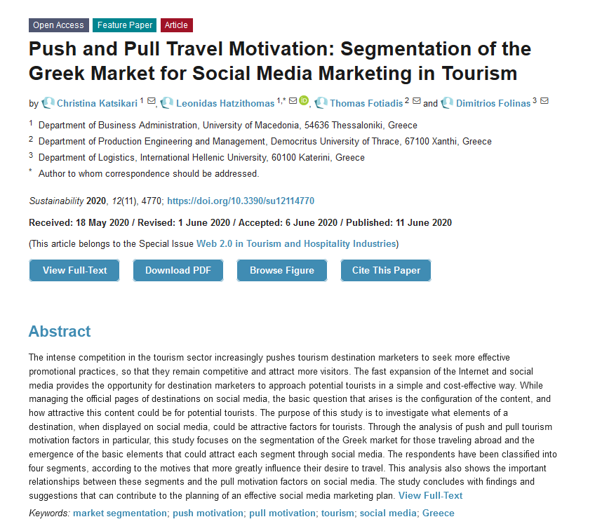 #SUSFeaturePaper Push and Pull Travel Motivation: Segmentation of the Greek Market for Social Media Marketing in Tourism; by Leonidas Hatzithomas @LHatzithomas et al., https://www.mdpi.com/2071-1050/12/11/4770 …; #marketsegmentation #motivation #tourism #SocialMediapic.twitter.com/6UVFIMvAWE