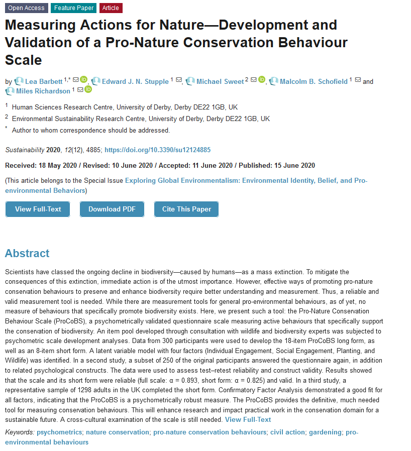 #SUSFeaturePaper Measuring Actions for Nature—Development and Validation of a Pro-Nature Conservation Behaviour Scale; by Lea Barbett et al., https://www.mdpi.com/2071-1050/12/12/4885 …; #natureconservation #civilactionpic.twitter.com/Rs2vTiwsMb