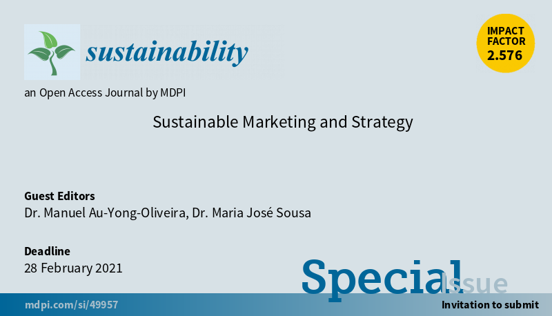 Special Issue "Sustainable Marketing and Strategy" welcomes submission Edited by Dr. Manuel Au-Yong-Oliveira and Dr. Maria José Sousa Deadline for submissions: 28 February 2021 More at: https://mdpi.com/journal/sustai pic.twitter.com/38ZTSmvMuz