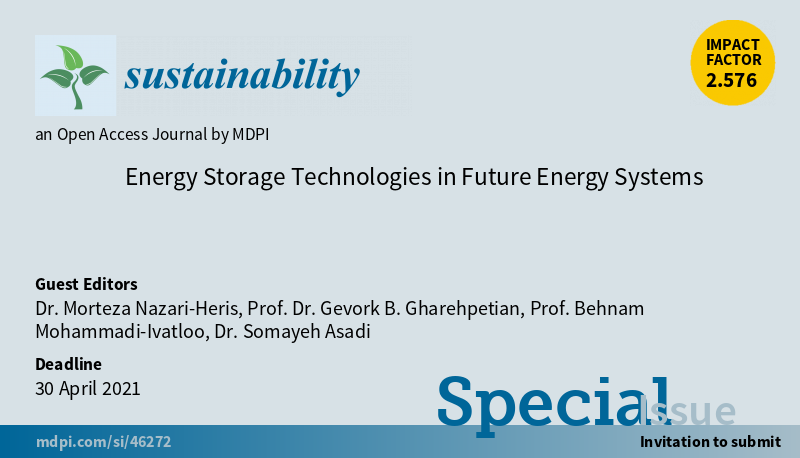 Special Issue “Energy Storage Technologies in Future Energy Systems” welcomes submission Edited by Dr. M. Nazari-Heris, Dr. G. B. Gharehpetian, Dr. B. Mohammadi-Ivatloo and Dr. S. Asadi #renewableenergy #smartgrid #networks More at: https://www.mdpi.com/journal/sustainability/special_issues/ESTFES …pic.twitter.com/YBqJT2TbDx