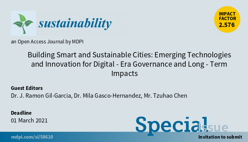 Special Issue "Building Smart and Sustainable Cities: Emerging Technologies and Innovation for Digital-Era Governance and Long-Term Impacts" welcomes submission Edited by Dr. J. Ramon Gil-Garcia, Dr. Mila Gasco-Hernandez and Mr. Tzuhao Chen More at: https://www.mdpi.com/journal/sustainability/special_issues/Digital-Era_Governance …pic.twitter.com/fjRUUxqZH0