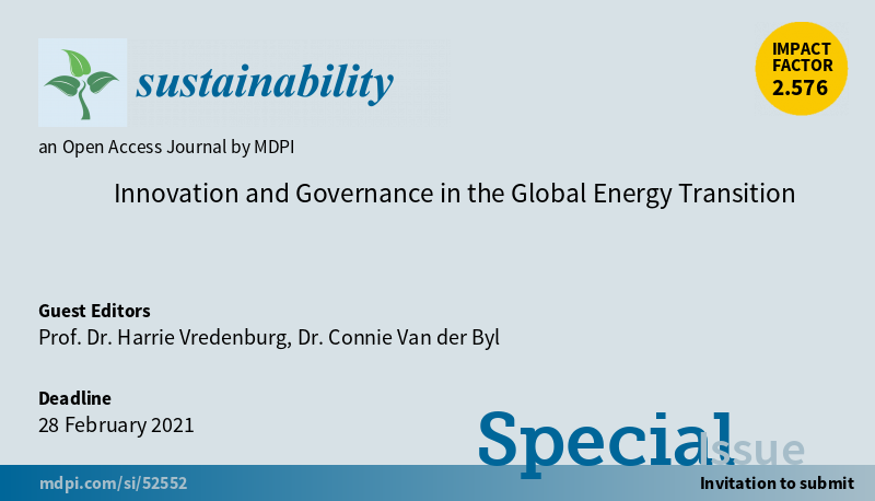 Special Issue "Innovation and Governance in the Global #EnergyTransition" welcomes submission Edited by Prof. Dr. Harrie Vredenburg and Dr. Connie Van der Byl Deadline for submissions: 28 February 2021 #Climate #Hydrogen #cleanenergy More at: https://www.mdpi.com/journal/sustainability/special_issues/global_energy …pic.twitter.com/D82mSRxwMj