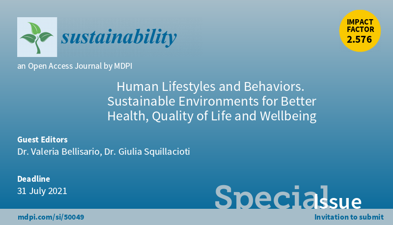 Special Issue "Human Lifestyles and Behaviors. Sustainable Environments for Better Health, Quality of Life and Wellbeing" welcomes submission Leading Guest Editor: Dr. Valeria Bellisario #lifestyle #Wellbeing #sustainability More at: https://www.mdpi.com/journal/sustainability/special_issues/HumanLifestyle_Wellbeing …pic.twitter.com/MEkxZ1yFty