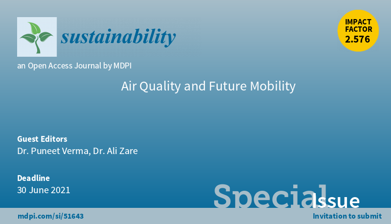 Special Issue "Air Quality and Future Mobility" welcomes submission Leading Guest Editor: Dr. Puneet Verma #Sustainability #Airquality #cleanenergy #Mobility #alternativefuels More at: https://www.mdpi.com/journal/sustainability/special_issues/Air_Quality_Mobility_sus …pic.twitter.com/dZSGMTVBRV