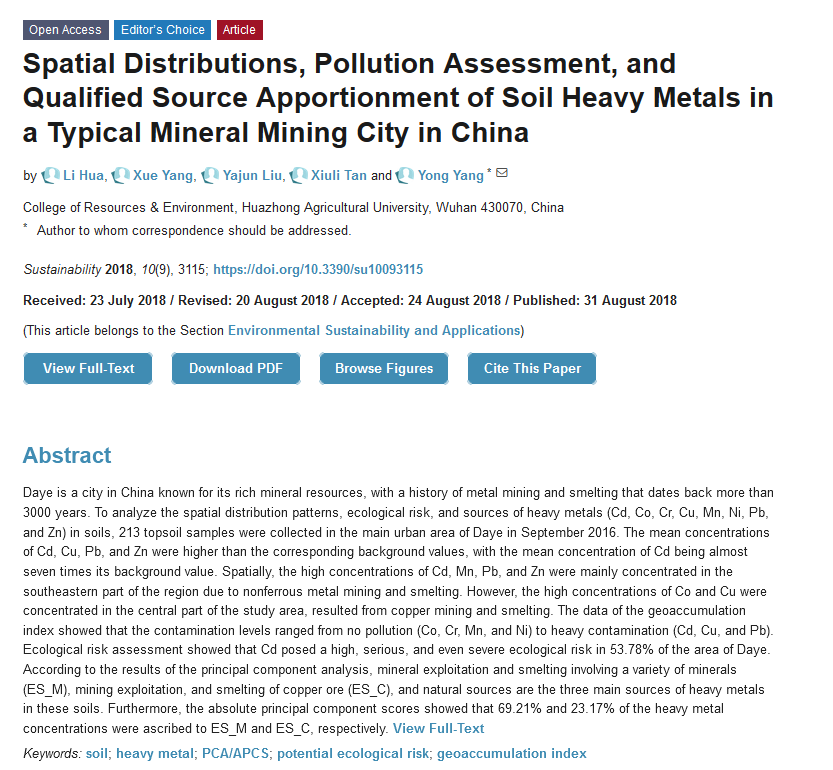 #SUSEditorialChoice Spatial Distributions, Pollution Assessment, and Qualified Source Apportionment of Soil Heavy Metals in a Typical Mineral Mining City in China by Li Hua et al., https://www.mdpi.com/2071-1050/10/9/3115 … #soil #heavymetal #PotentialEcologicalRiskpic.twitter.com/UHn8mfG5xn