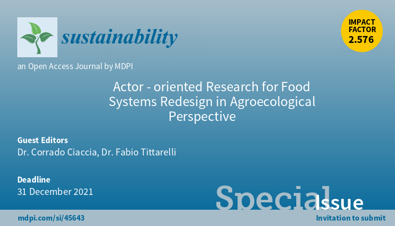 #Sustainability Special Issue "Actor-oriented Research for Food Systems Redesign in Agroecological Perspective" welcomes submission Lead Guest Editor: Dr. Corrado Ciaccia #agroecology #food #consumer #foodgovernance More at: https://www.mdpi.com/journal/sustainability/special_issues/food_Agroecological_sus …pic.twitter.com/JU2nbcWTz9